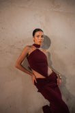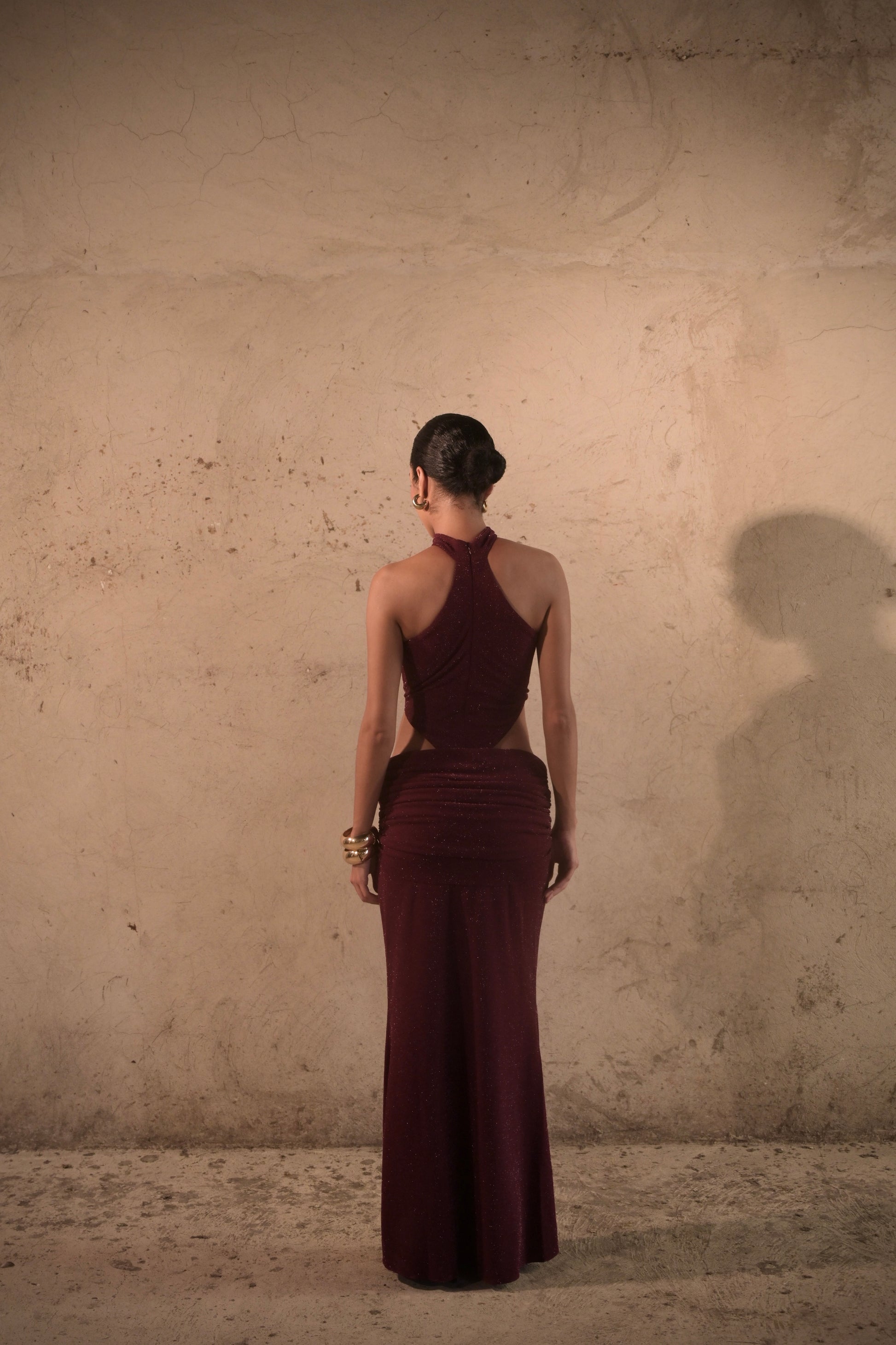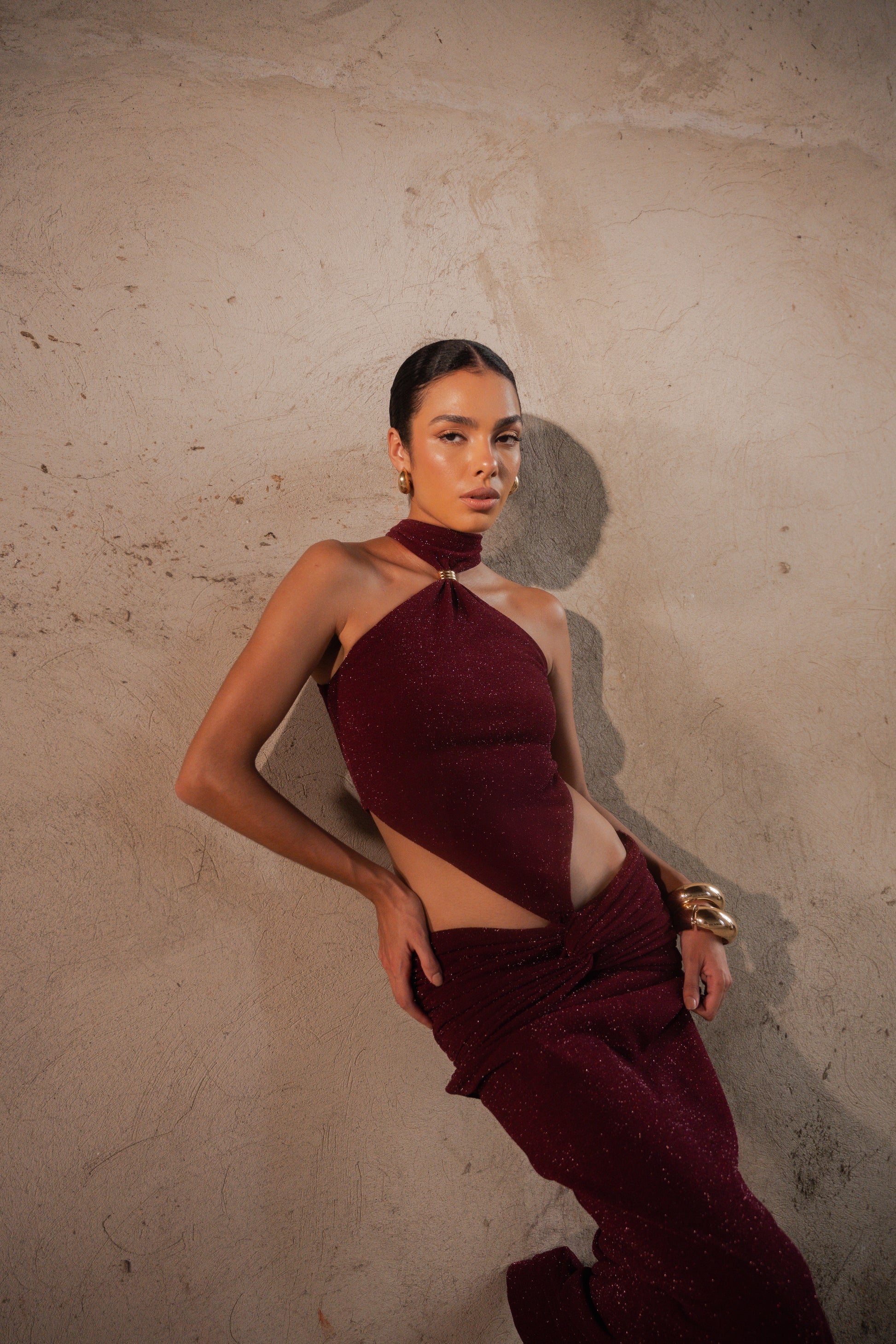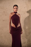 Ember es un vestido de alto impacto, creado para resaltar cada movimiento con la sutileza de su tejido luminoso en tono burgundy. Su diseño presenta un escote halter con cortes estratégicos en la cintura, realzado por un accesorio dorado que aporta un toque de lujo. La falda larga con drapeado frontal y posterior equilibra sensualidad y elegancia, creando una silueta imponente que celebra la feminidad con un aire contemporáneo.