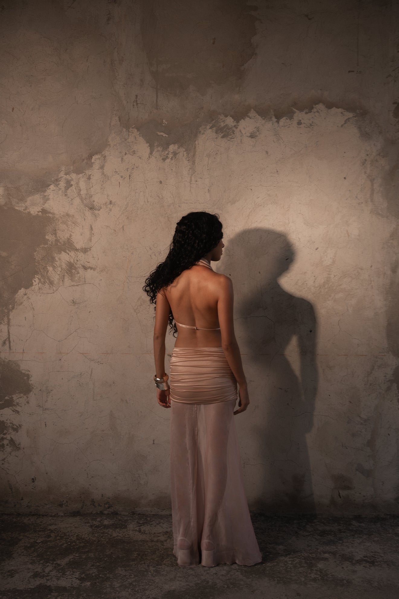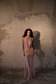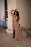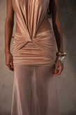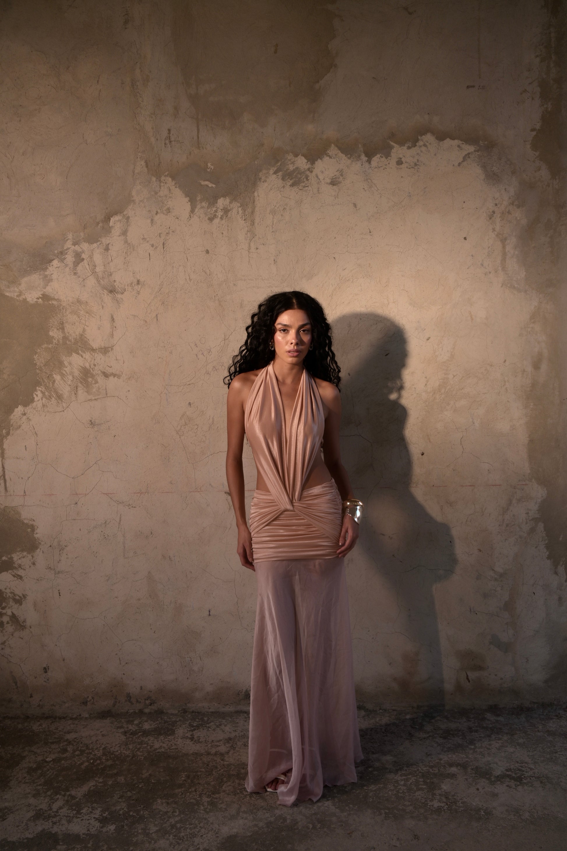 Lumen es una pieza que celebra la sensualidad y el minimalismo contemporáneo. Su espalda descubierta y escote profundo estilo halter crean una silueta alargada y sofisticada, mientras que la falda drapeada se equilibra con una caída de malla translúcida que añade fluidez al diseño. Confeccionado en un tejido brillante , se adapta al cuerpo como una segunda piel, realzando la feminidad con un toque etéreo.